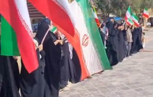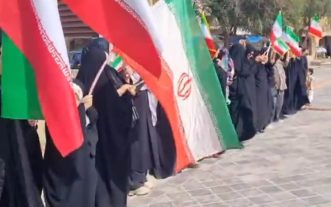 Hombres, mujeres y niños llevan banderas iraníes y pancartas