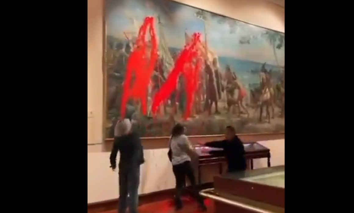 El hecho se registró en video en sus propias redes sociales donde exponen de manera textual: "lanzamos pintura biodegradable al cuadro Primer Homenaje a Cristóbal Colón, en el Museo Naval". Se trata de la obra Primer homenaje a Cristóbal Colón, de José Garnelo.