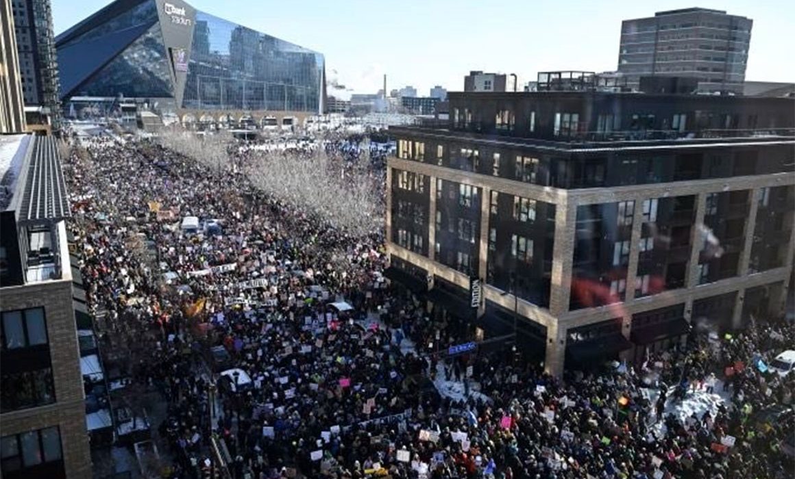 TRENTON, Nueva Jersey, EU, 24 de enero de 2026.- Desafiando el intenso frío, miles de personas salieron a las calles este viernes 23 de enero en Minneapolis, Minnesota, para protestar en contra del Servicio de Inmigración y Control de Aduanas (ICE).