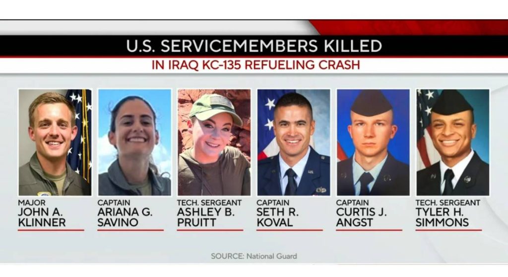 Las víctimas fueron el capitán Seth R. Koval, de 38 años; el capitán Curtis J. Angst, de 30; el sargento técnico Tyler H. Simmons, de 28; el mayor John A. Klinner, de 33; la capitana Ariana G. Savino, de 31; y la sargento técnica Ashley B. Pruitt, de 34.