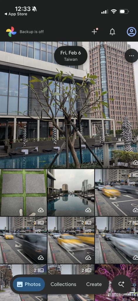 La nueva barra se ubica sobre el contenido, ligeramente por encima del borde inferior de la pantalla. Desde allí se puede cambiar entre Fotos, Colecciones y Crear, mientras que en uno de los extremos se mantiene un botón de acción para buscar o usar la función Preguntar.