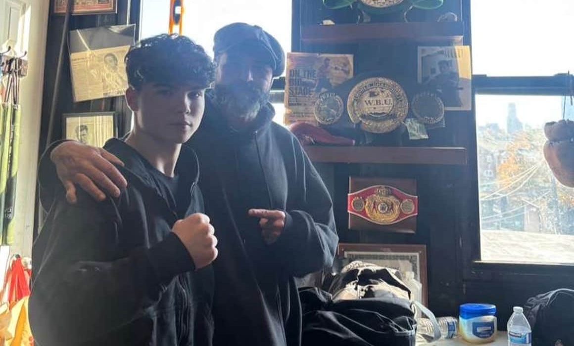 ATLANTIC CITY, Nueva Jersey, EU, 8 de noviembre de 2025.- El histórico campeón de boxeo de North Bergen, Danny McDermott, acompaña a su hijo Kane, un joven de 15 años que debutará en Atlantic City, la ciudad emblemática para el pugilismo estadounidense.
