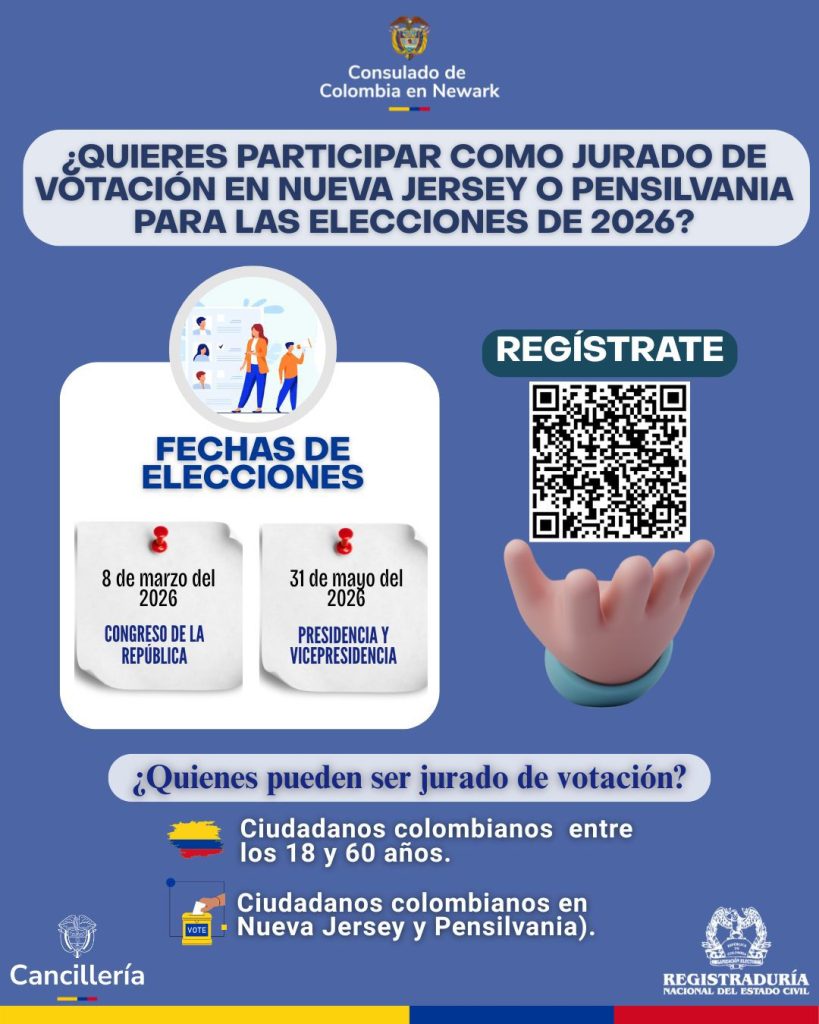 TRENTON, Nueva Jersey, EU, 16 de noviembre de 2025.- El Consulado de Colombia en Nueva Jersey ha lanzado una convocatoria dirigida a los ciudadanos colombianos residentes en Nueva Jersey o Pensilvania que deseen participar como jurados de votación en los comicios que se celebrarán en 2026. La iniciativa busca fomentar la participación activa de la diáspora en el proceso democrático de la nación andina, contribuyendo a la transparencia y seguridad electoral. La invitación es específica para las dos jornadas de votación programadas para el próximo año.