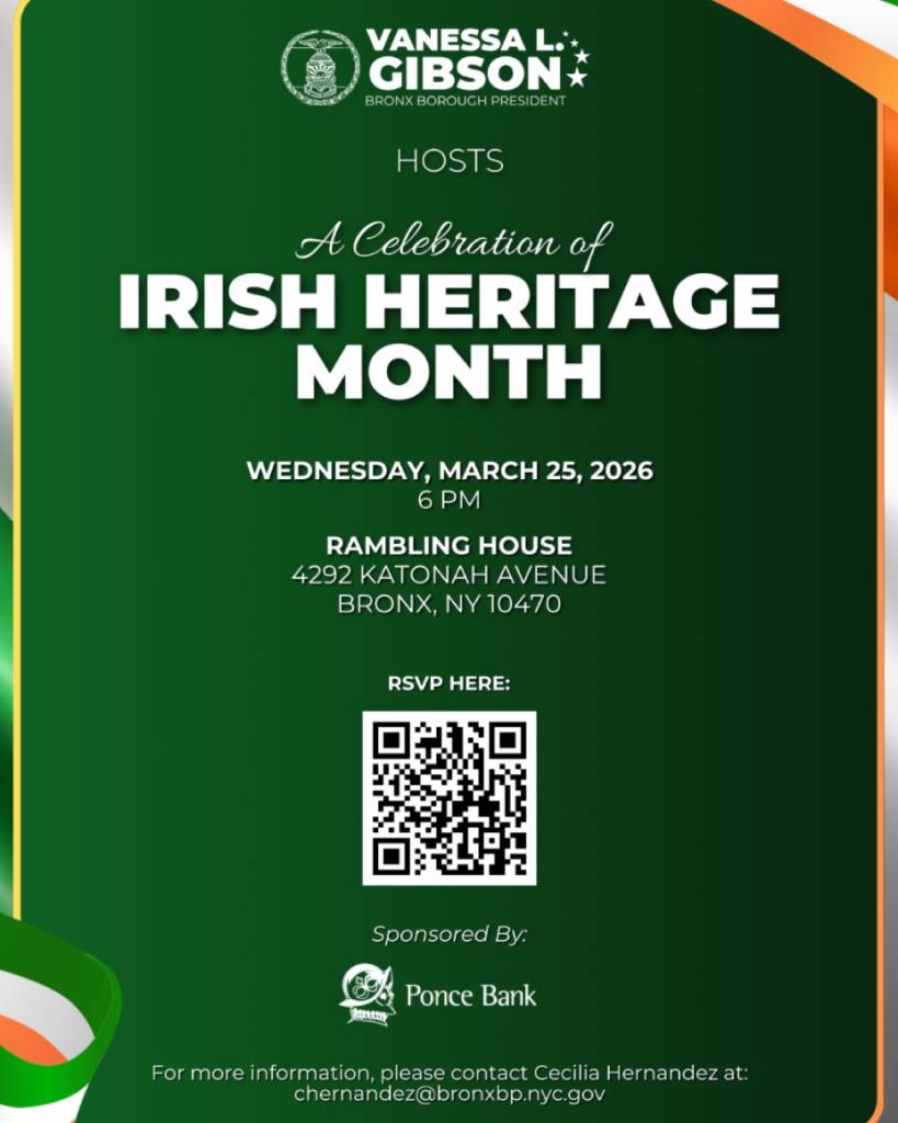 TRENTON, Nueva Jersey, EU, 17 de marzo de 2026.- La presidenta del condado del Bronx, Vanessa L. Gibson, invita a la comunidad a participar en la celebración del Mes de la Herencia Irlandesa, que se llevará a cabo el próximo miércoles 25 de marzo de 2026.
