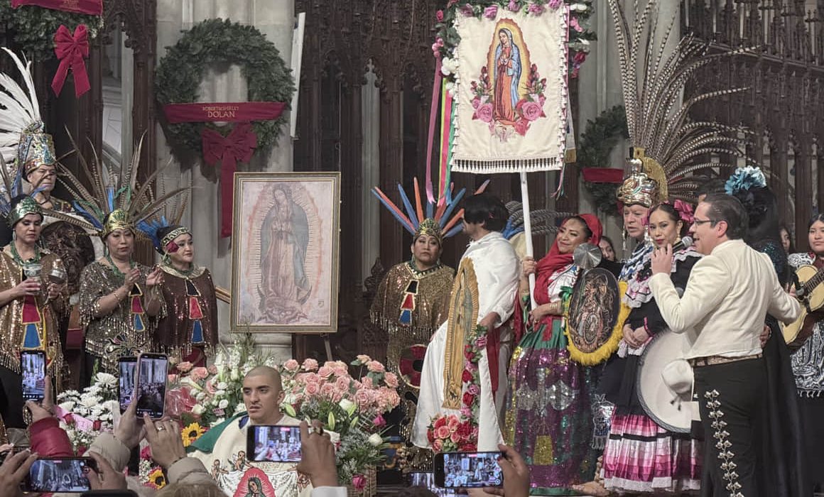 MANHATTAN, Nueva York, EU, 11 de diciembre de 2025.- Con devoción, alegría y nostalgia los devotos de la Virgen de Guadalupe llegaron a la iglesia San Patrick, en Nueva York, para celebrar la tradicional ceremonia de Las Mañanitas, donde en medio del ambiente religioso se le dedicó una serenata al ritmo de mariachis y música folclórica de México, de donde La Morenita, como cariñosamente se le conoce, es la patrona.