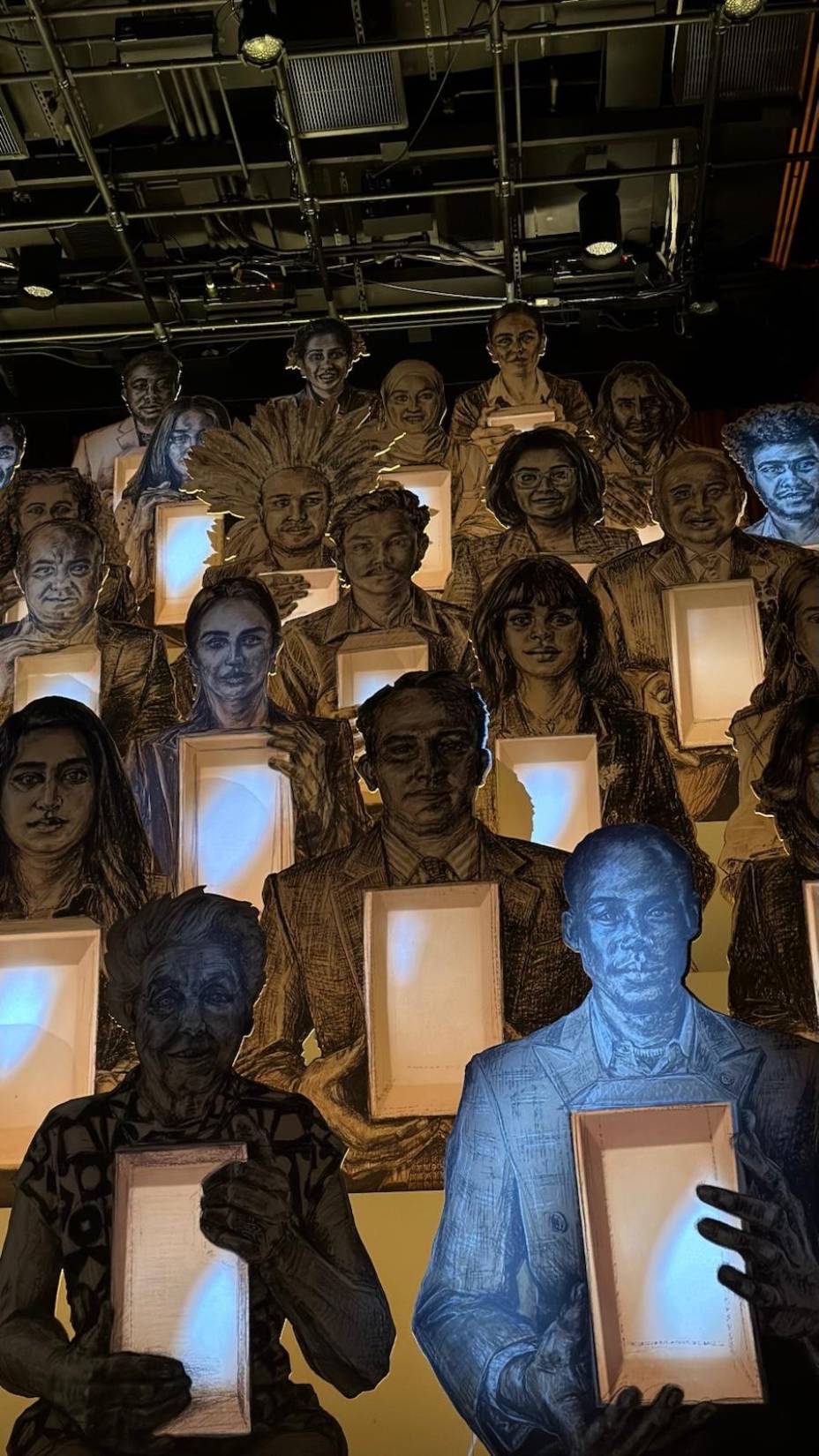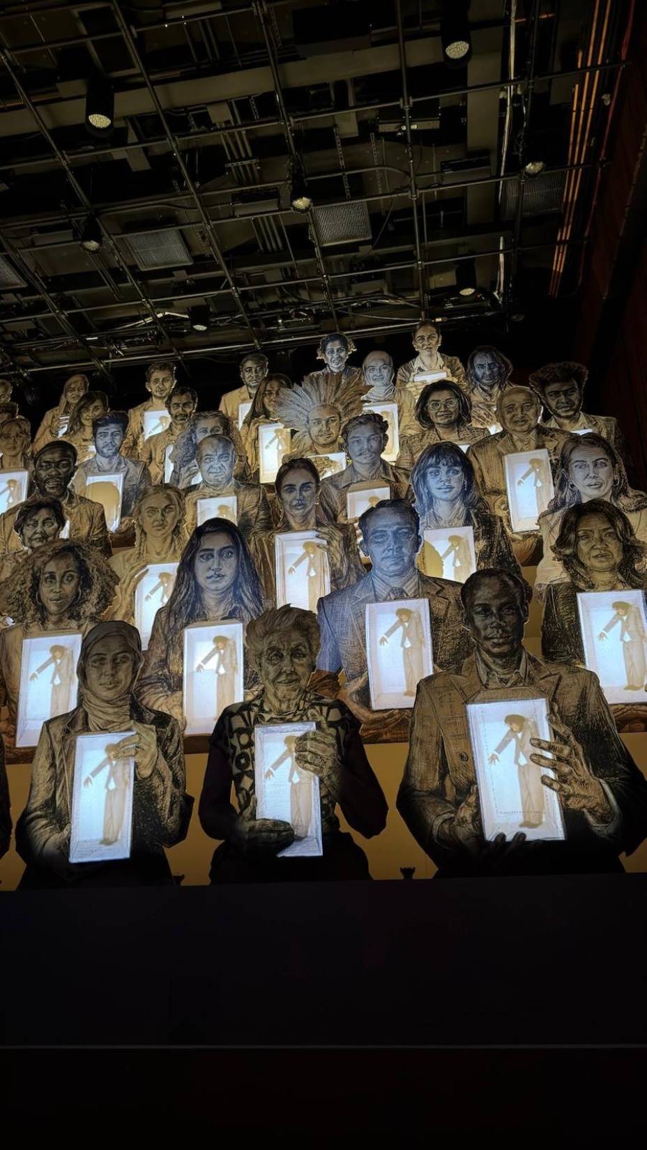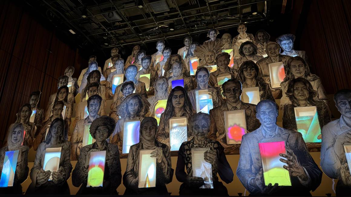 Congregation está compuesta por retratos a gran escala en tiza y carbón de 50 personas residentes en Londres que han vivido el desplazamiento forzado de sus países de origen. Las imágenes, proyectadas sobre una escultura escalonada mediante tecnología de projection mapping, crean un encuentro luminoso y profundamente humano con quienes han reconstruido sus vidas en un nuevo territorio.