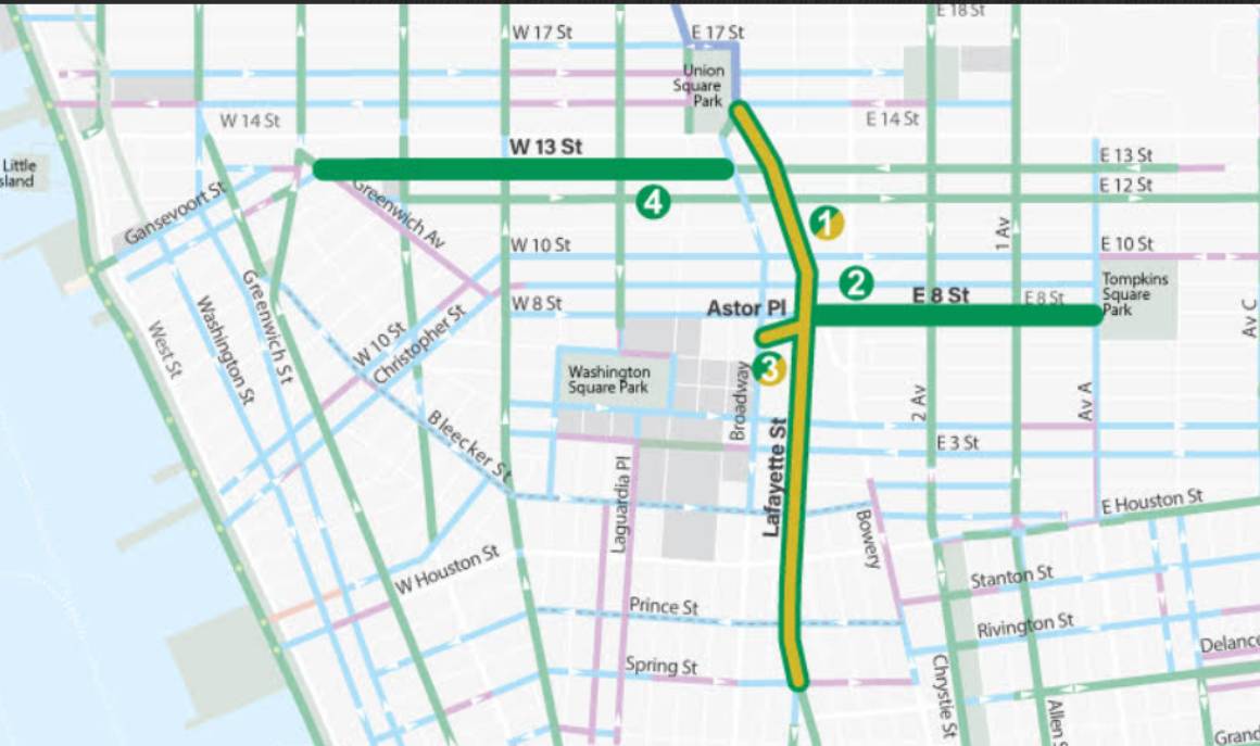 En materia peatonal, el plan incluye ampliaciones de aceras y la instalación de extensiones pintadas en Fourth Avenue, así como la futura construcción de islas peatonales de concreto entre Spring Street y East 14th Street entre 2026 y 2027.