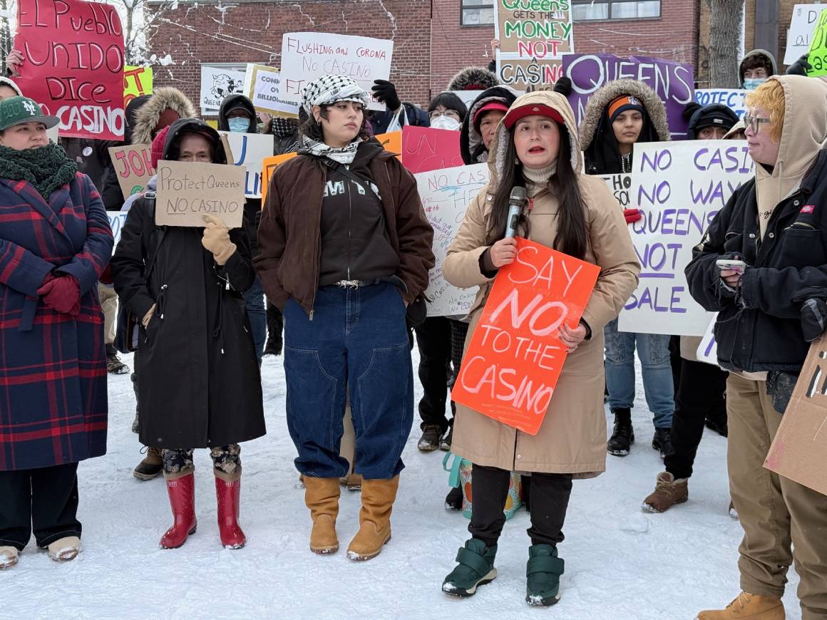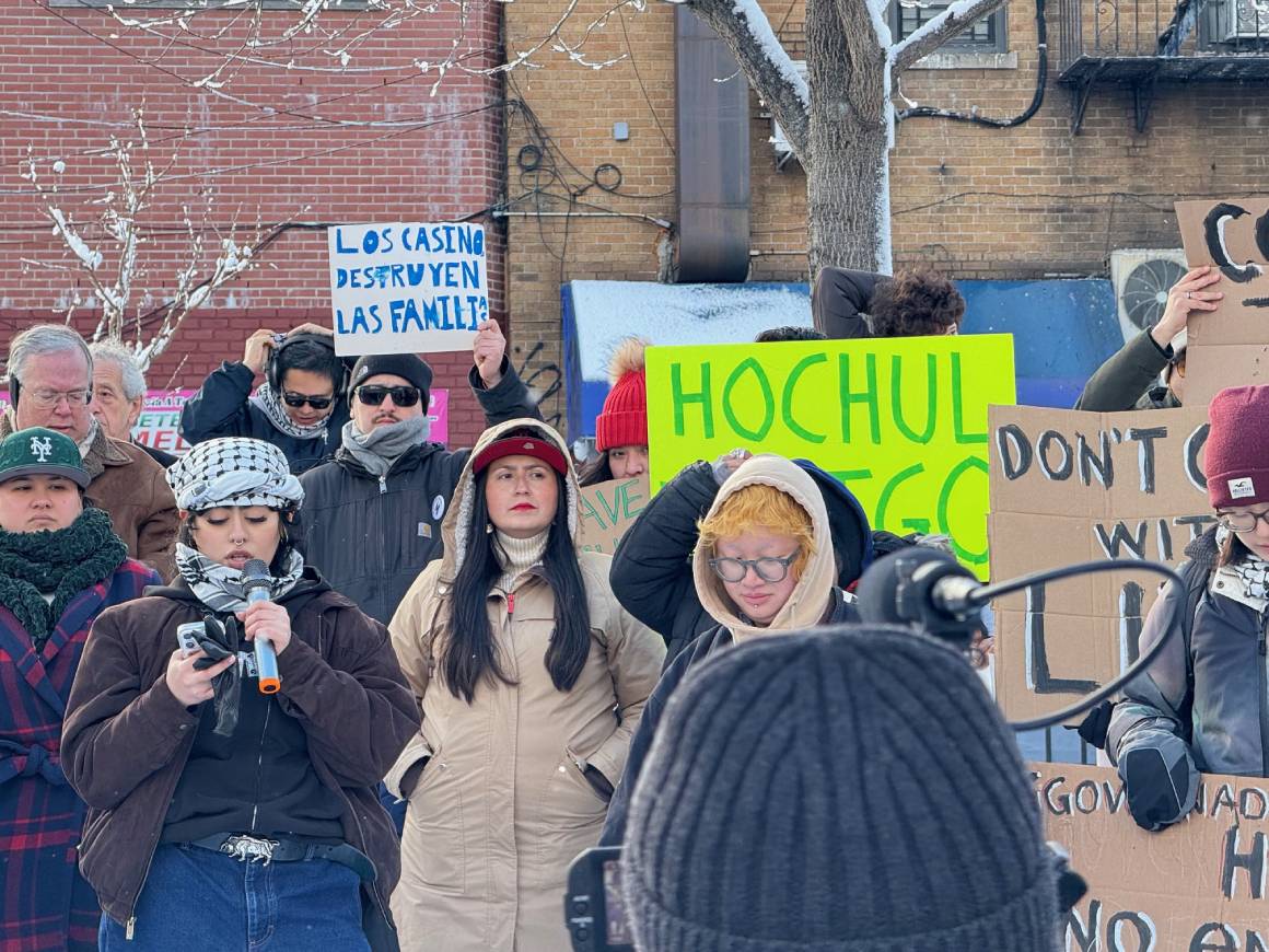 “Gobernadora Hochul estamos aquí desafiando el frío de la temporada invernal para exigirle que haga algo a favor de la comunidad de Queens, quienes estamos rechazando la construcción de los casinos que la Junta de Juegos Estatal aprobó. Nuestros gobernadores electos se han doblegado ante la corrupción y dejan nuestras vidas en manos de sus amigos multimillonarios. En estas mismas calles hay cientos de familias inmigrantes que han sido separadas al ser deportados algunos de sus miembros. ¿Gobernadora qué está haciendo usted para proteger a los habitantes de Queens? Nada.”, dijo Raquel, habitante de Queens.