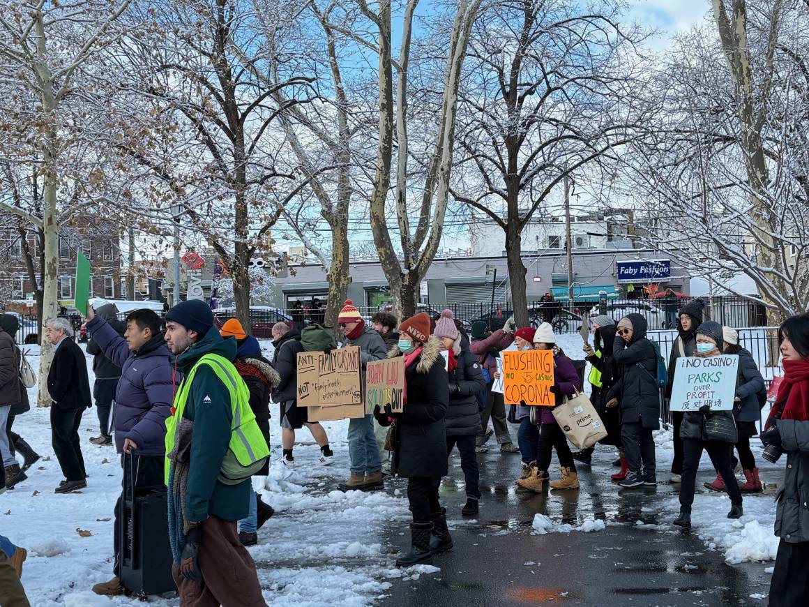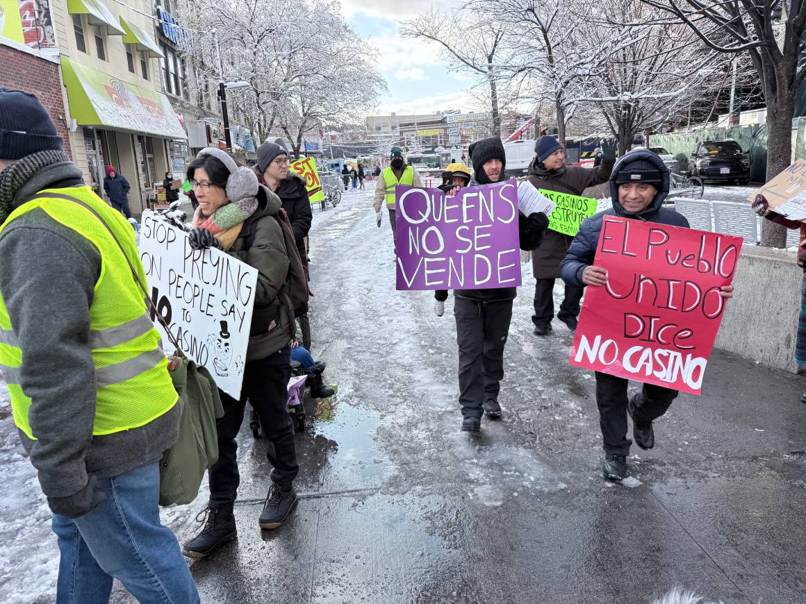 QUEENS, Nueva York, EU, 14 de diciembre de 2025.- Con carteles en mano y bocinas, cientos de habitantes de Queens salieron a las calles este domingo para mostrar su inconformidad con el proyecto de la empresa Metropolitan Park, que busca construir un casino en los estacionamientos del estadio Citi Field, casa del equipo de béisbol los Mets.
