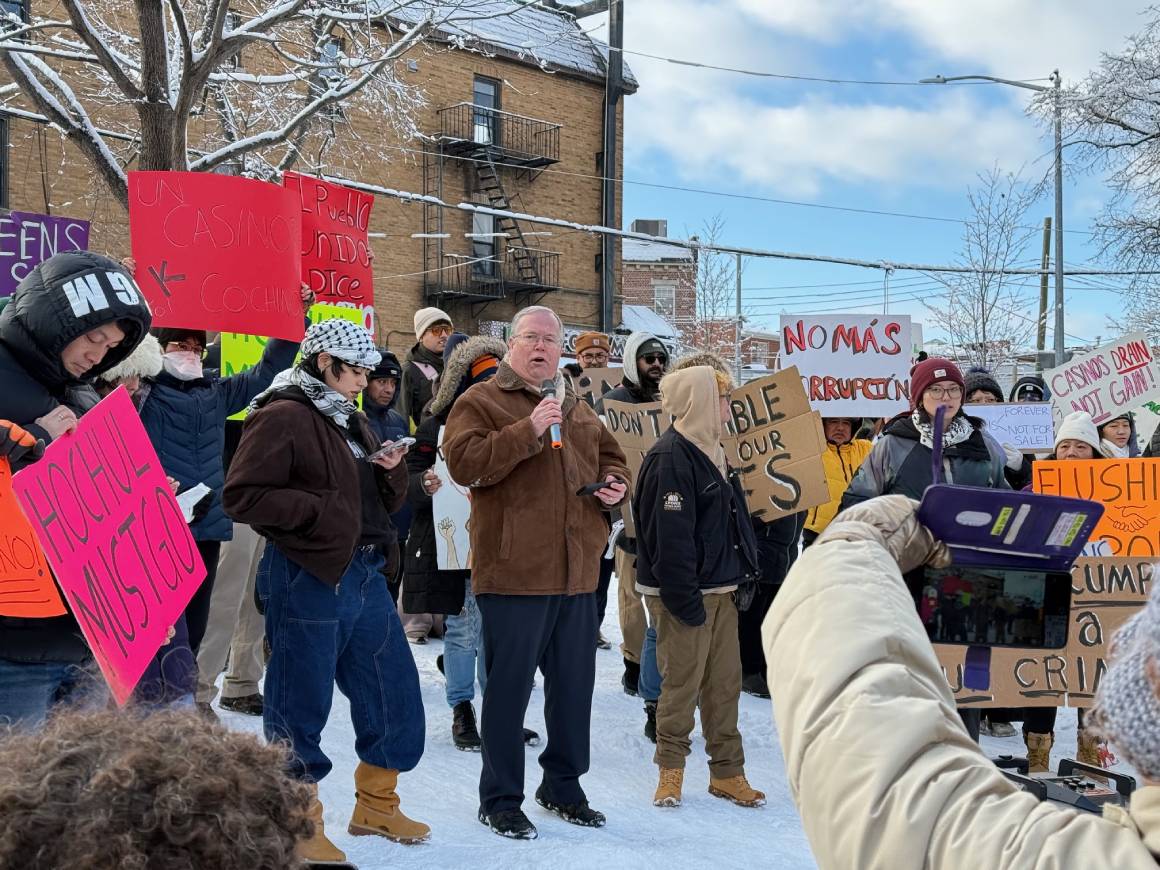 “Me llena el corazón ver tantos vecinos que han salido hoy a pesar del frío, a pesar de la nieve, para hacerse sentir, hacer que sus voces sean escuchadas al respecto del casino. Mi gran temor es que sea un poco tarde, ya que la decisión final de la junta será mañana. Y sería un desastre para nuestro barrio en sí, sabiendo que somos un barrio obrero de gente trabajadora que no merece tener la tentación de poder apostar sus pocas ganancias para poder sacar adelante a sus familias. Y por eso estoy también muy desilusionada con muchos de mis colegas que dicen ser progresistas, sin embargo, no están aquí”, aseguró la senadora demócrata.