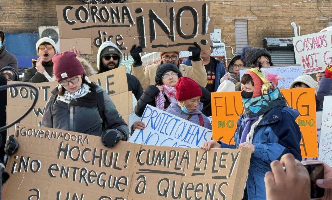 “Gobernadora Hochul estamos aquí desafiando el frío de la temporada invernal para exigirle que haga algo a favor de la comunidad de Queens, quienes estamos rechazando la construcción de los casinos que la Junta de Juegos Estatal aprobó. Nuestros gobernadores electos se han doblegado ante la corrupción y dejan nuestras vidas en manos de sus amigos multimillonarios. En estas mismas calles hay cientos de familias inmigrantes que han sido separadas al ser deportados algunos de sus miembros. ¿Gobernadora qué está haciendo usted para proteger a los habitantes de Queens? Nada.”, dijo Raquel, habitante de Queens.