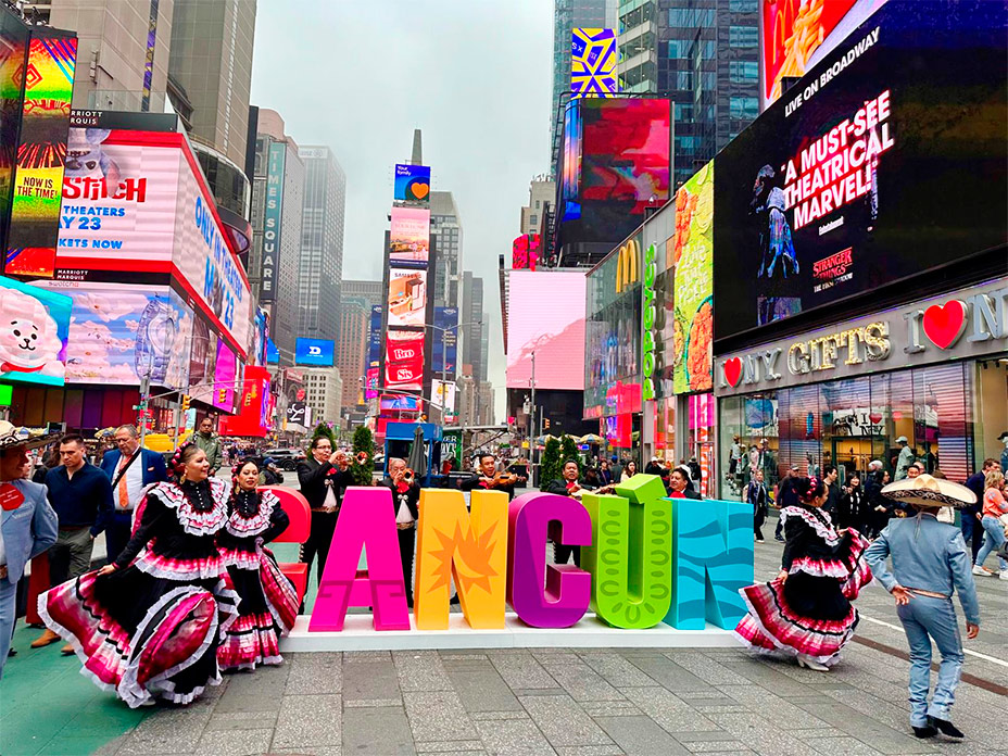 NUEVA YORK, EU., 5 de mayo de 2025.- Con bailes típicos mexicanos, música y un letrero gigante con el nombre de Cancún, en el corazón de Times Square, se tiñó de colores este lunes 5 de mayo para celebrar la develación oficial de las letras de la ciudad turística más famosa de México.