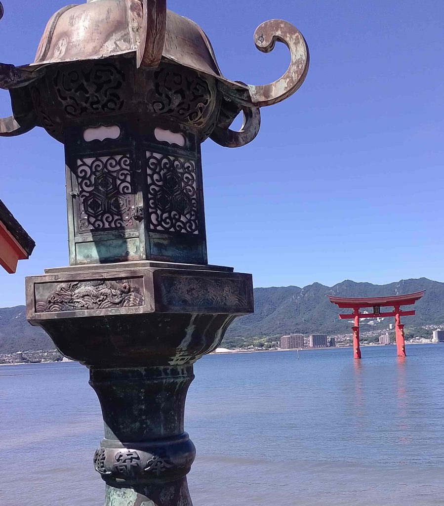 Al llegar al puerto de Miyajimaguchi se abordó un ferry que nos introdujo a la isla Miyahima, desde cubierta pudimos admirar la enorme puerta sagrada torii, de 16 metros de altura, con 60 toneladas de peso, que se cree proviene del año 593, aunque no hay confirmación de su existencia hasta 811.