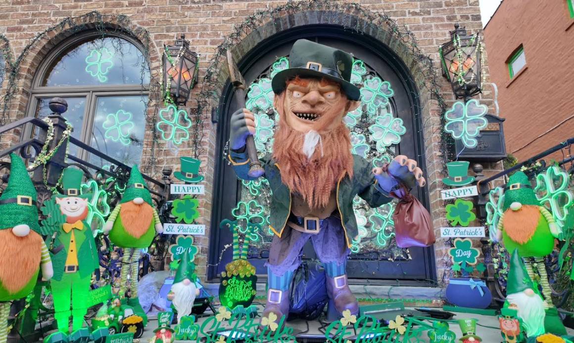 Hoy, la decoración no solo incluye luces y figuras, sino también escenas completas relacionadas con cada celebración. En el caso del Día de San Patricio, la casa recrea un ambiente festivo lleno de símbolos irlandeses como tréboles, arcoíris y pequeñas representaciones de duendes.